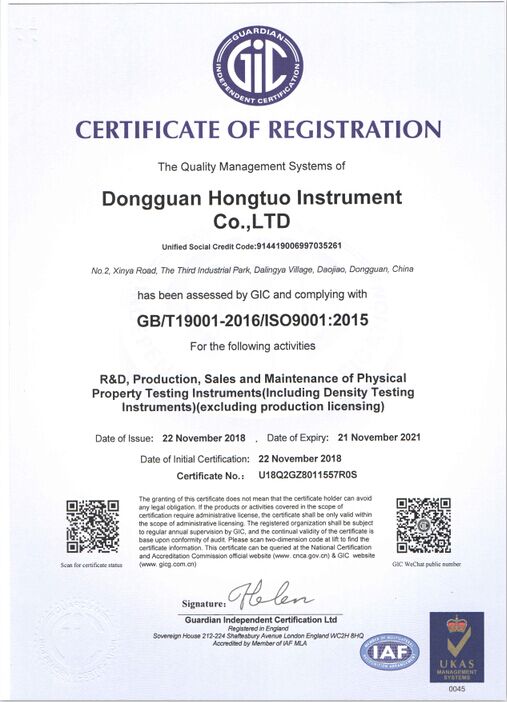 宏拓儀器通過ISO9001:2015質量體系管理認證,通過國家計量測試中心全面質量與性能檢測,獲得國家計量器具型式批準CPA證書,參與起草制定: 【GB/T 1040.1-2025塑料 拉伸性能的測定】、【GB/T 1634.1-2025塑料 負荷變形溫度的測定】、【GB/T 44559.1-2024塑料 硬質塑料沖孔性能的測定】 、【GBT 43139-2023鑄造鋁合金液減壓凝固試樣密度檢測】......等標準。